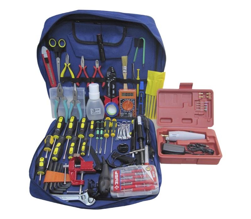 Набор инструментов электроника профессиональный (аналог ProsKit 1PK-1900NB) состоит из 45 предметов и включает плоскогубцы, отвертки, шестигранные ключи, ключи гаечные метрические, мультиметр, микро-дрель, тиски, паяльник, инструмент для извлечения микросхем. Комплектуется в удобную инструментальную сумку с ручками и плечевым ремнем.