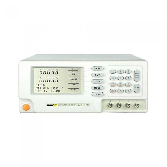 Прецизионный измеритель RLC ПрофКиП Е7-14М предназначен для измерения иммитанса различных электро- радиокомпонентов: резисторов, конденсаторов, катушек индуктивности, полупроводниковых приборов на восьми измерительных частотах: 100 Гц, 120 Гц, 1 кГц,10 кГц, 20 кГц, 30 кГц, 60 кГц, 100 кГц.  Благодаря автоматизации процесса измерения может использоваться в системах контроля и управления технологическими и производственными процессами.