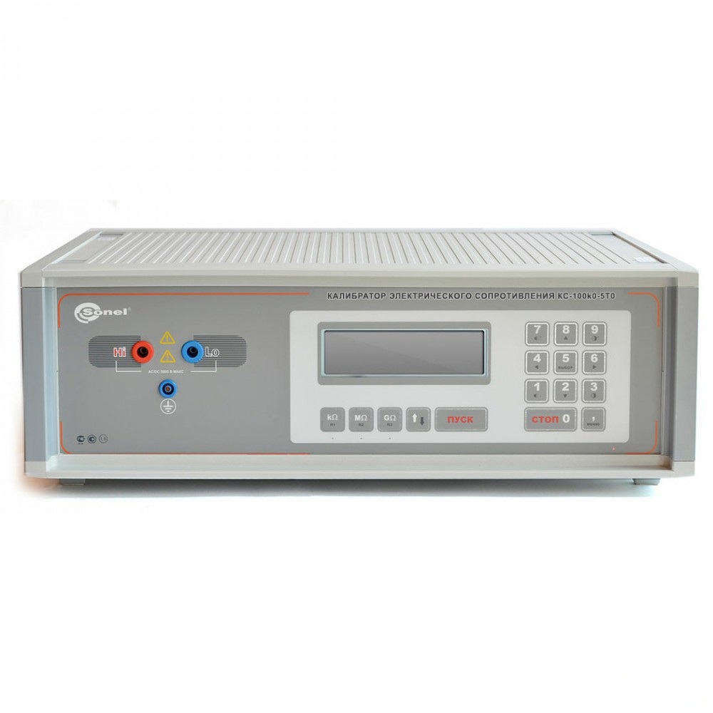 Калибратор КС-100k0-5T0 обеспечивает воспроизведение электрического сопротивления в диапазоне от 100 кОм до 5 ТОм. Предел допускаемой основной погрешности - ± 1,5%. Необходимое сопротивление устанавливается пользователем с помощью клавиатуры калибратора.