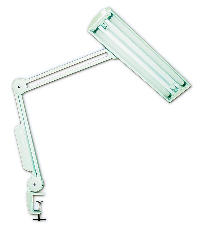 Светильник бестеневой АТР-6010: напряжение питания 220-240 В, две люминесцентные лампы по 15 Вт. Крепление к столу струбциной. Пантографический механизм. Цвет: белый.