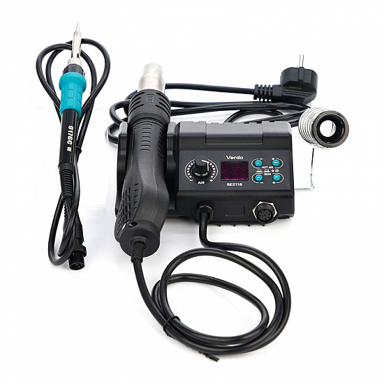 VERDO SE2116 — это многофункциональная паяльная станция, идеально подходящая для различных задач пайки и ремонта электроники. Она оснащена цифровым дисплеем для точной настройки температуры и контроля процесса пайки. Станция объединяет в себе паяльник и термофен, что позволяет выполнять широкий спектр работ, от пайки мелких компонентов до снятия и установки микросхем. Удобный интерфейс и эргономичный дизайн делают VERDO SE2116 отличным выбором как для профессионалов, так и для любителей.