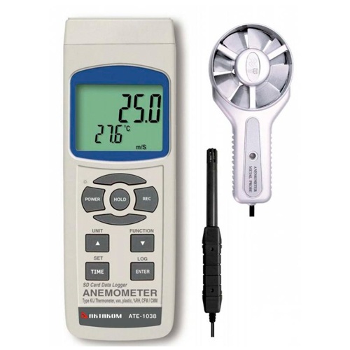 Портативный анемометр АТЕ-1038 является комбинированным прибором для измерения параметров воздушного потока, температуры и относительной влажности окружающей среды, температуры контактным методом при помощи термопар. Прибор снабжен усиленной металлической крыльчаткой с шарикоподшипниками низкого трения, которая позволяет проводить измерения даже при больших скоростях воздушного потока (до 35 м/с). Помимо измерения скорости и температуры потока воздуха, прибор позволяет вычислять объем проходящего через крыльчатку воздуха, а внешний датчик влажности делает возможным вычисления точки росы и температуры смоченного термометра. АТЕ-1038 может подключаться к компьютеру, а, кроме того, имеется возможность сохранения измеренных данных на карту SD в формате Excel в режиме реального времени без использования специального программного обеспечения.